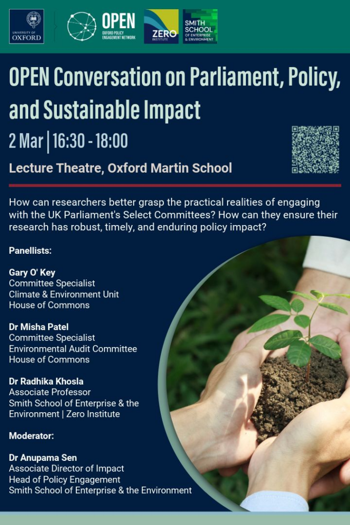 Speakers include parliamentary committee specialists Misha Patel (University of Oxford, Department of Engineering Science alumna) and Gary O’Key, and Radhika Khosla, Associate Professor, Smith School of Enterprise and the Environment – University of Oxford. The event is moderated by Dr Anupama Sen, Associate Director of Impact and Head of Policy Engagement at the Smith School.